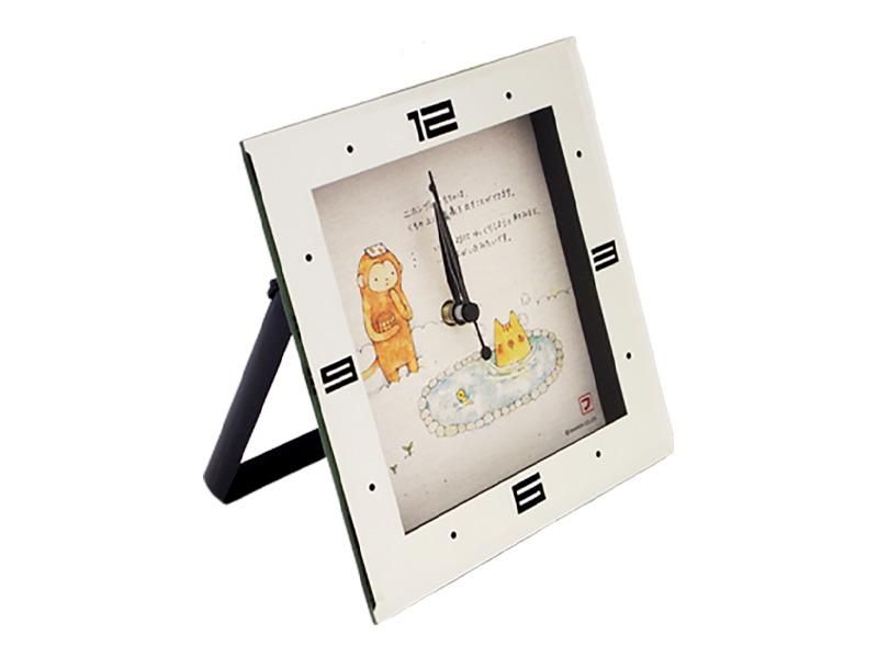 鏡張りの文字盤に、麻生地にイラストをのせた、ナチュラルで落ち着いたデザイン。